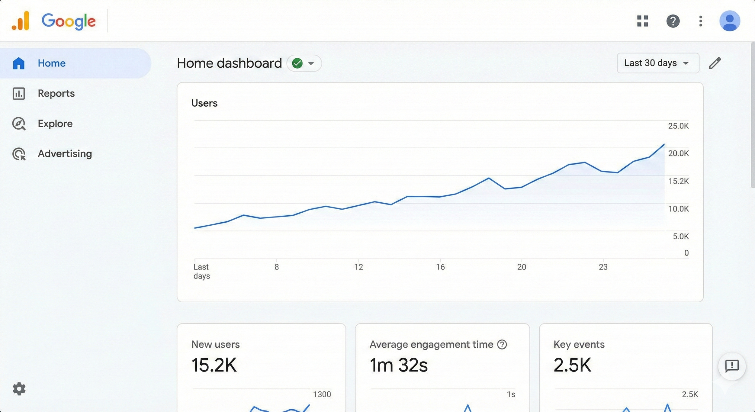 As shown in the dashboard above, you can immediately see trends in your user base, how long they're spending on your site, and how many are completing important actions ("Key events"). This is your starting point for digging deeper.